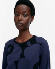 Kevät-tunika on valmistettu luomupuuvillatrikoosta ja siinä on niukka istuvuus, A-linjainen leikkaus ja Unikko-kuosi. Tunikassa on omalla kankaalla viimeistelty pyöreä pääntie ja pitkät hihat.