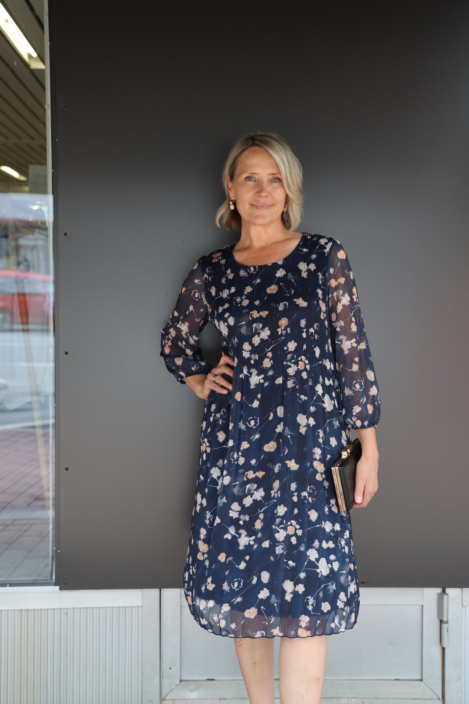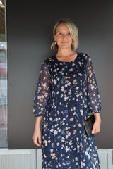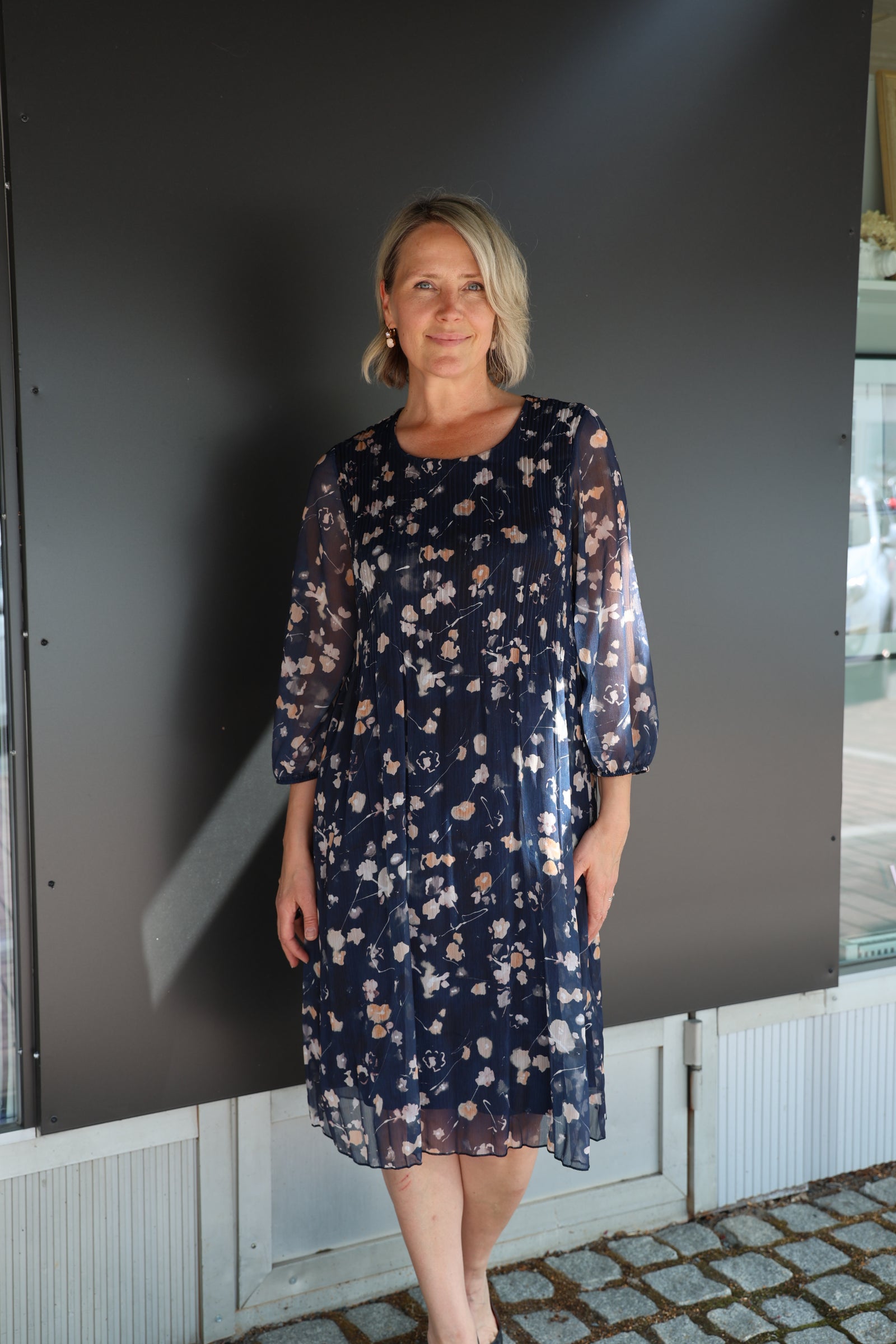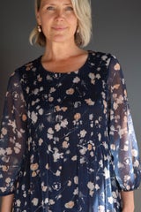 Pliseerattu syvän sininen mekko, jossa lämpimän sävyinen kukkakuosi. Mekossa vuori, pyöreä kaula-aukko ja vajaamittaiset läpikuultavat hihat.