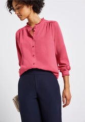 Pirteän roosa paita jossa röyhelömäinen pystykaulus nappikiinnityksella.