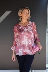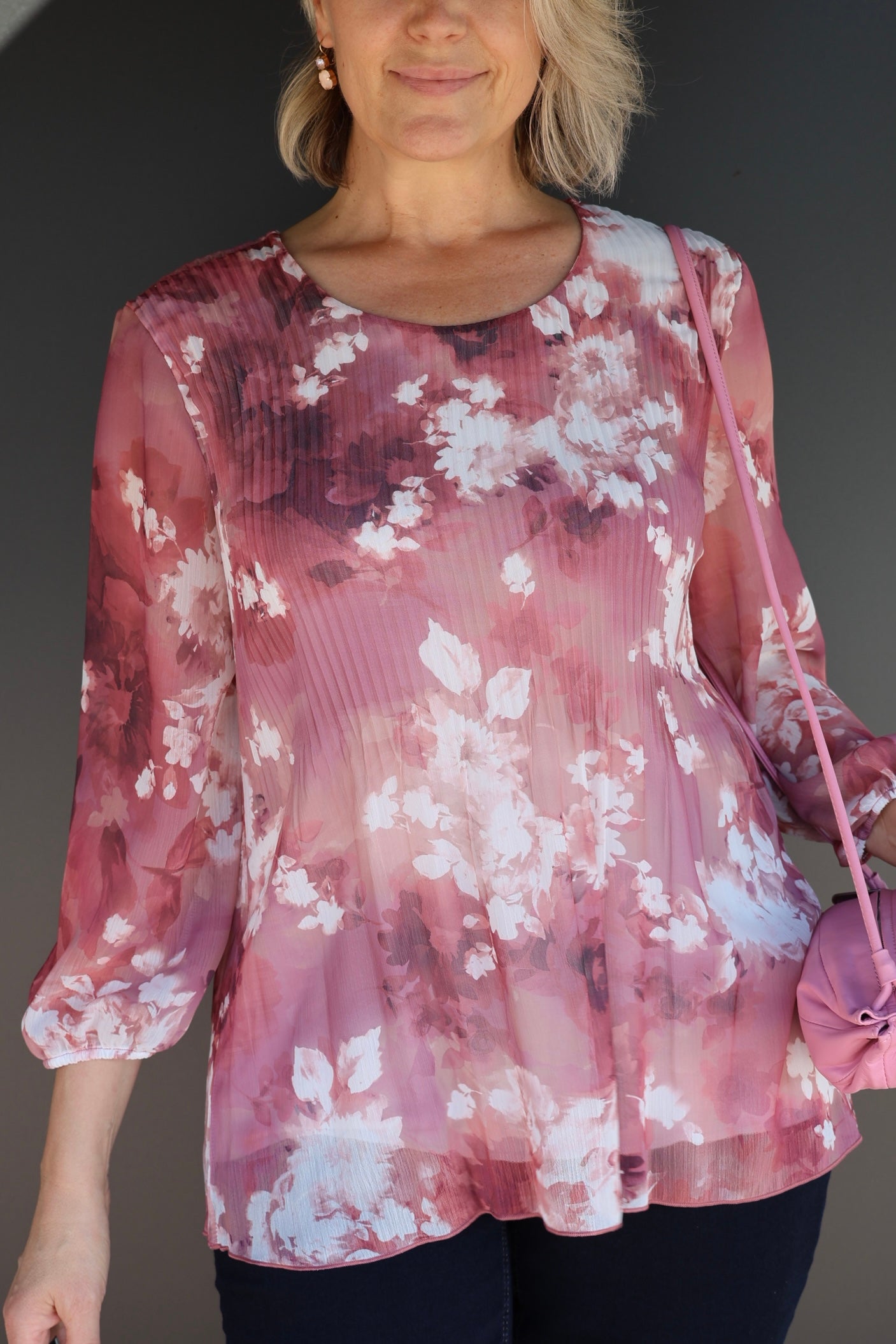 Pliseerattu roosa paita, jossa vaalea kukkakuosi. Paidassa vuori, pyöreä kaula-aukko ja vajaamittaiset läpikuultavat hihat.