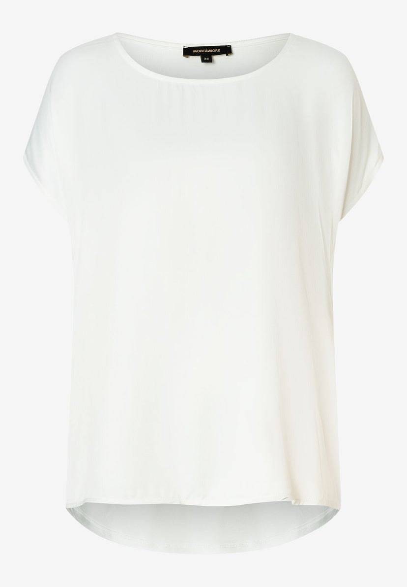 Kevyesti hohtava satiinipaita, jossa yhdistyvät elegantti etuosa ja miellyttävän pehmeä viskoositrikoo takana. Rento istuvuus, madalletut olkapäät ja pyöreä pääntie tuovat pehmeän, modernin ilmeen. Helma on hieman pidempi takaa, mikä tekee mallista kauniisti laskeutuvan ja helposti yhdisteltävän.