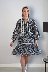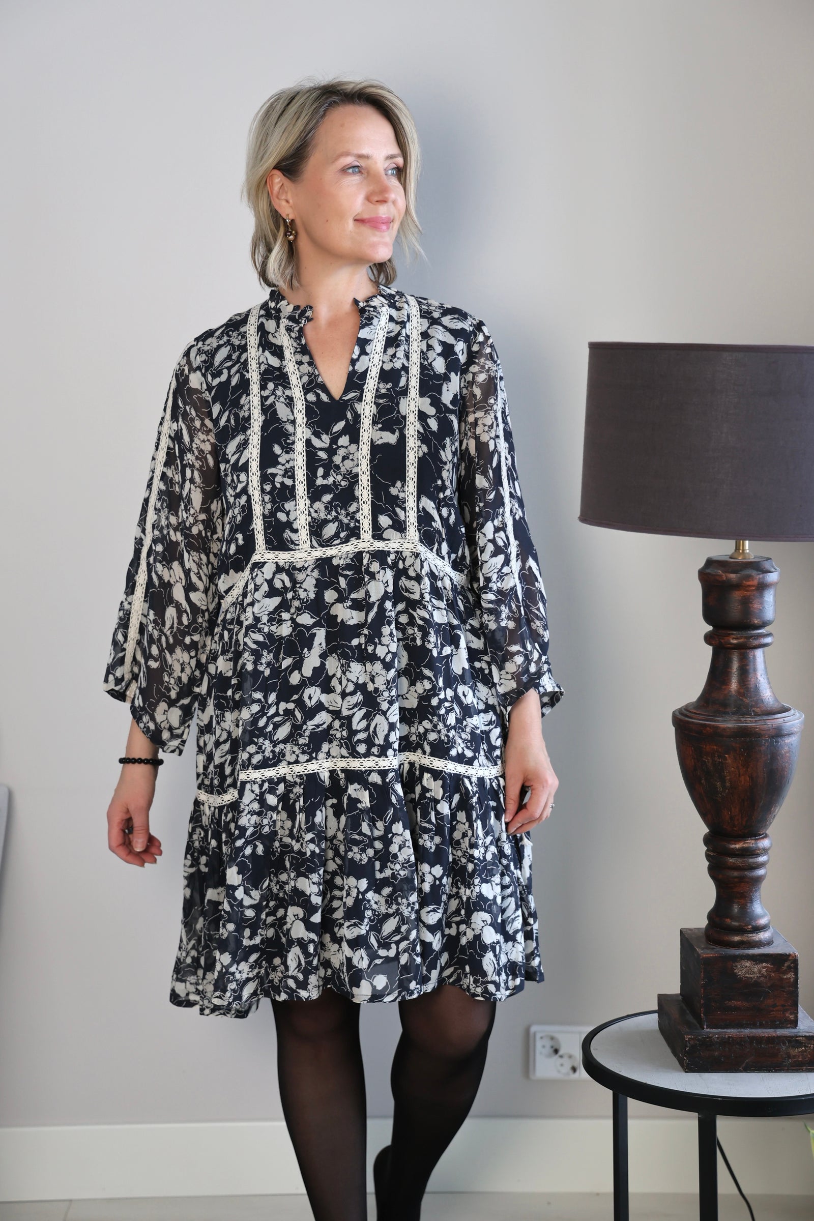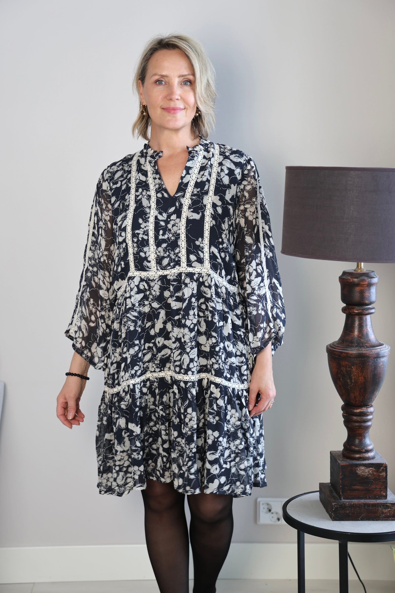 Mekossa tummansinisellä pohjalla vaalea kuvio. Kauniit läpikuultavat 3/4 hihat, napillinen pyöreä pääntie sekä valkoiset pitsiset yksityiskohdat. Mekossa vuori.