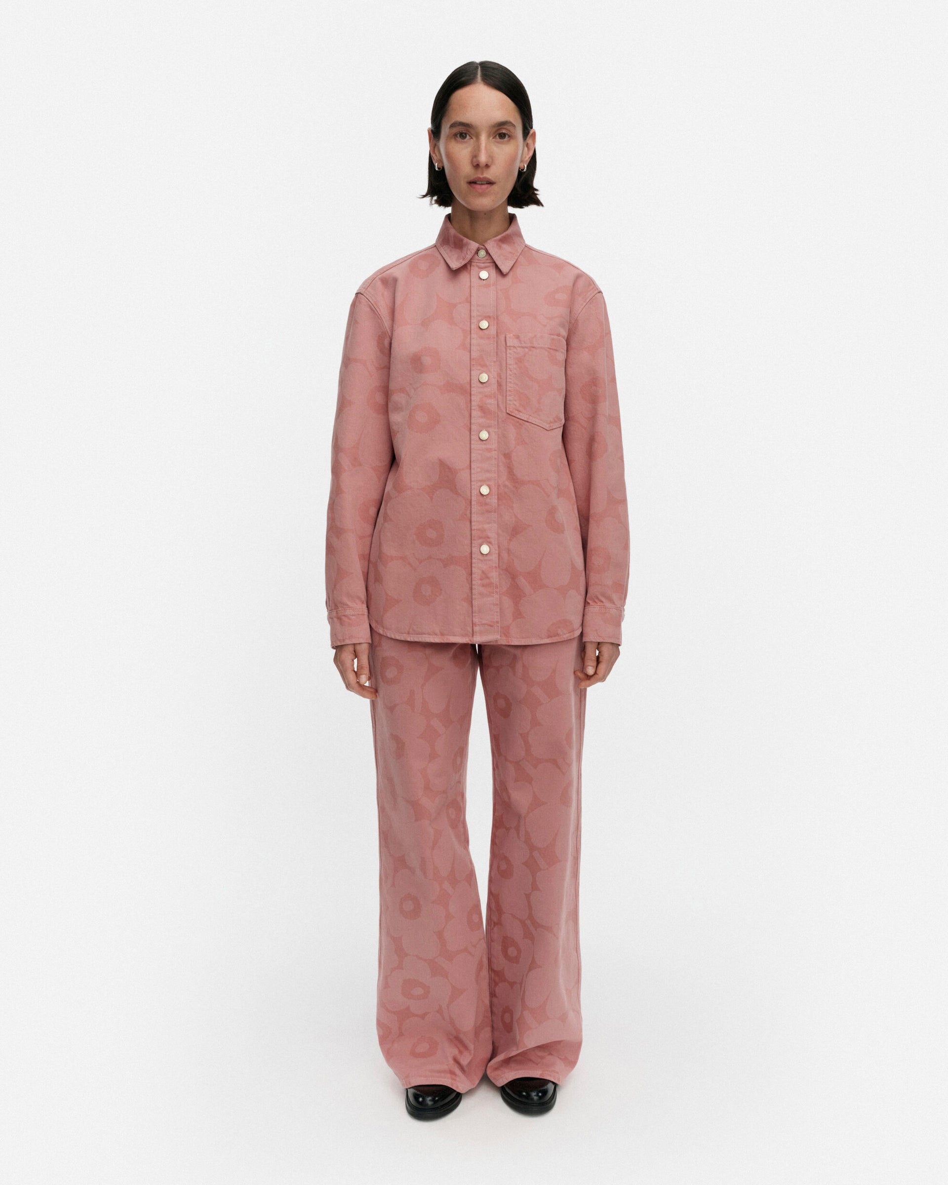 Vaaleanpunainen, Unikko-kuosinen Maridenim Vaihe -farkkupaita on valmistettu puuvillakankaasta, joka ei sisällä elastaania. Farkkukauluspaidassa on rento istuvuus, nappisuljenta, rintatasku ja takana kaarrokesauma. Hihansuissa on mansetit ja nappisuljenta ja helmassa on loivasti pyöristetty leikkaus. Paidassa on Marimekko-farkkunapit.