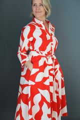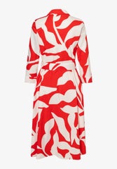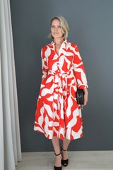 Punainen kauluspaitamekko levenevällä helmalla jossa taskut. Mekossa nappilista alas asti, solmittava vyö vyötäröllä ja 3/4-pituiset hihat, joissa halkiot.
