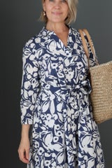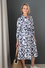 Sinivalkoinen kauluspaitamekko levenevällä helmalla jossa taskut. Mekossa nappilista alas asti, solmittava vyö vyötäröllä ja 3/4-pituiset hihat, joissa halkiot.