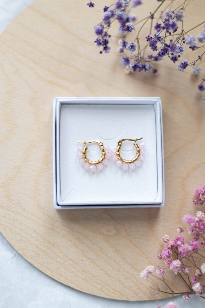 Ihastuttavat joka asuun sopivat Alma korvakorut on valmistettu käsin upeista laadukkaista kristallilasihelmistä punomalla ne kuparilangalla joka on päällystetty hopealla sekä langan värillä.