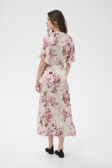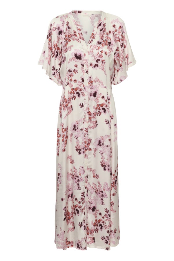 Pitkässä mekossa luonnonvalkoisella pohjalla roosa kukkaprintti. Kauniisti laskeutuvat perhoshihat, v-kaula-aukko sekä edessä nappikiinnitys ja taskut.