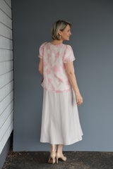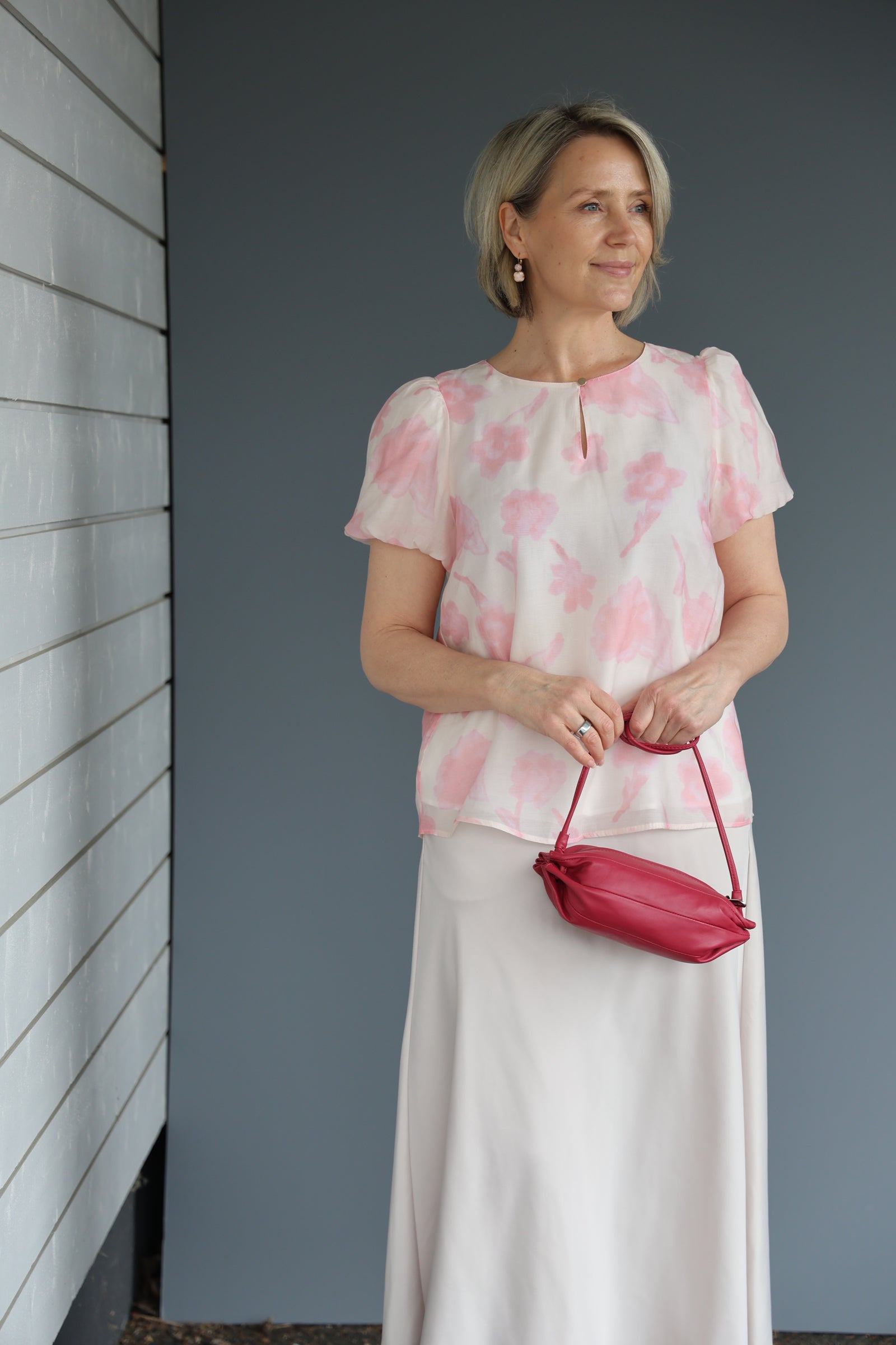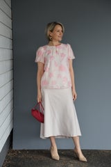 Paidassa raikkaan roosa kukkaprintti hennon vaaleanpunaisella pohjalla. Paidan ominaisuuksiin kuuluu pyöreä kaula-aukko nappikiinnityksellä, puhvihihat sekä vuori.