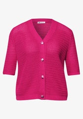 Virkattu pinkki neuletakki jossa hopeat koristenapit, v-kaula-aukko sekä joustoresorit helmassa ja hihansuissa. Otathan huomioon että kangas joustaa hieman.