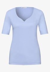 Vaaleansininen trikoopaita jossa kaunis sydänpääntie ja lyhyet hihat. Paidan etupuolella kaksinkertainen kangas.